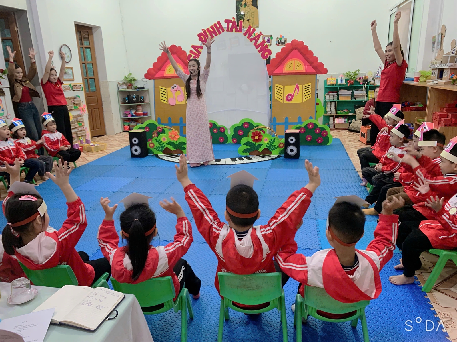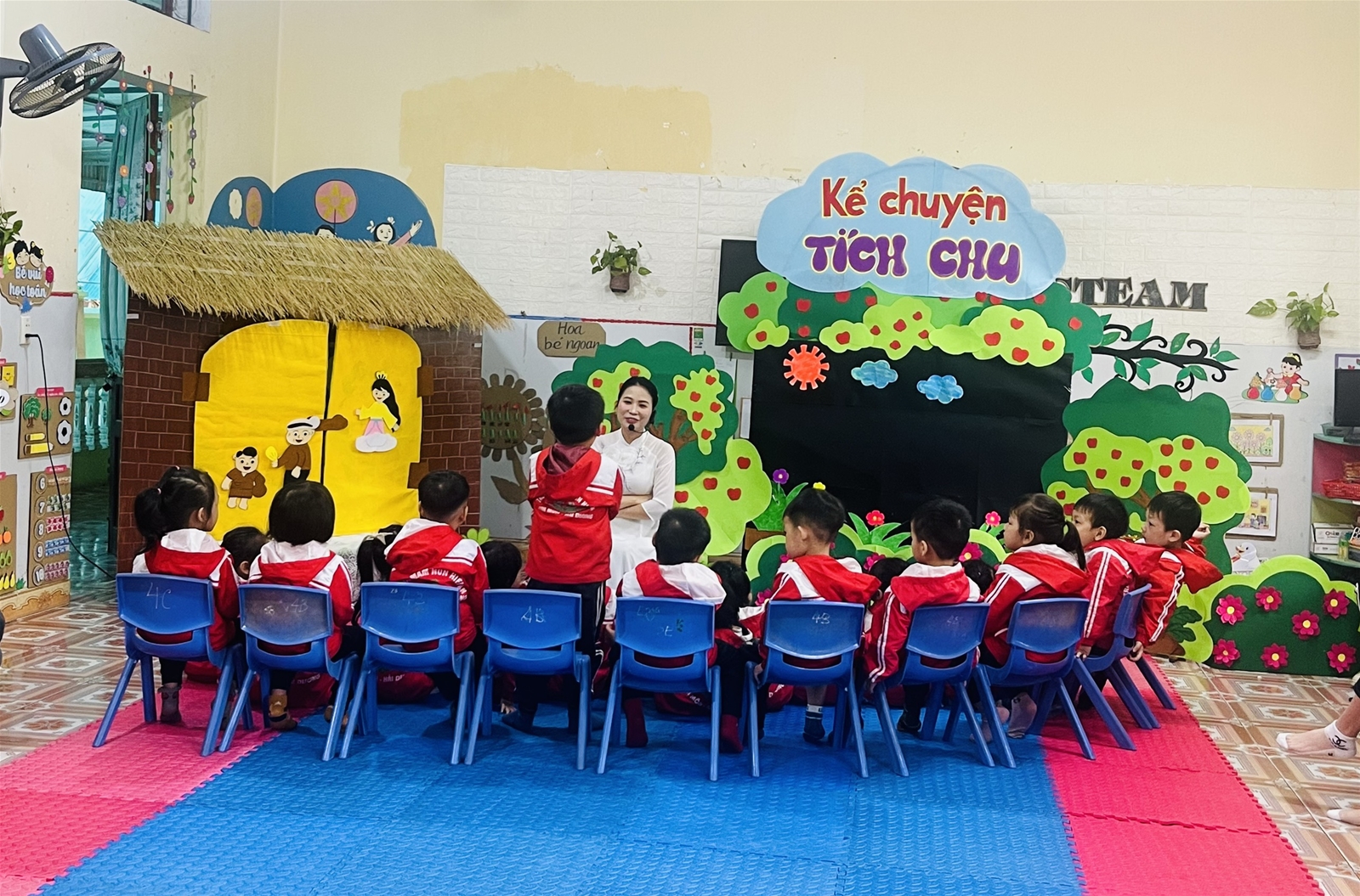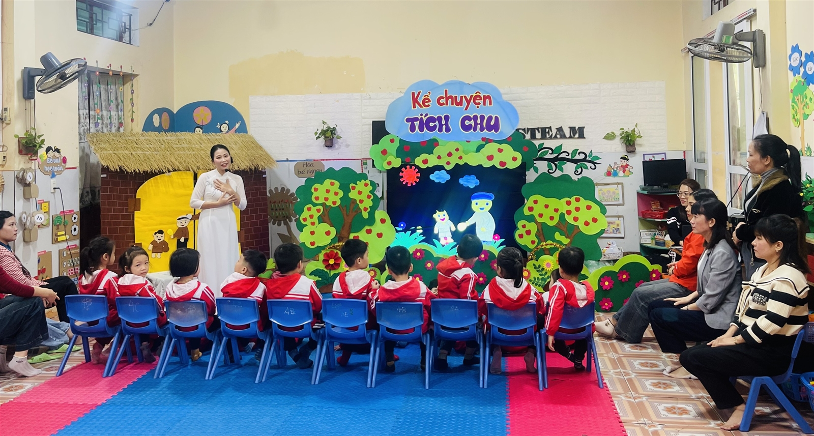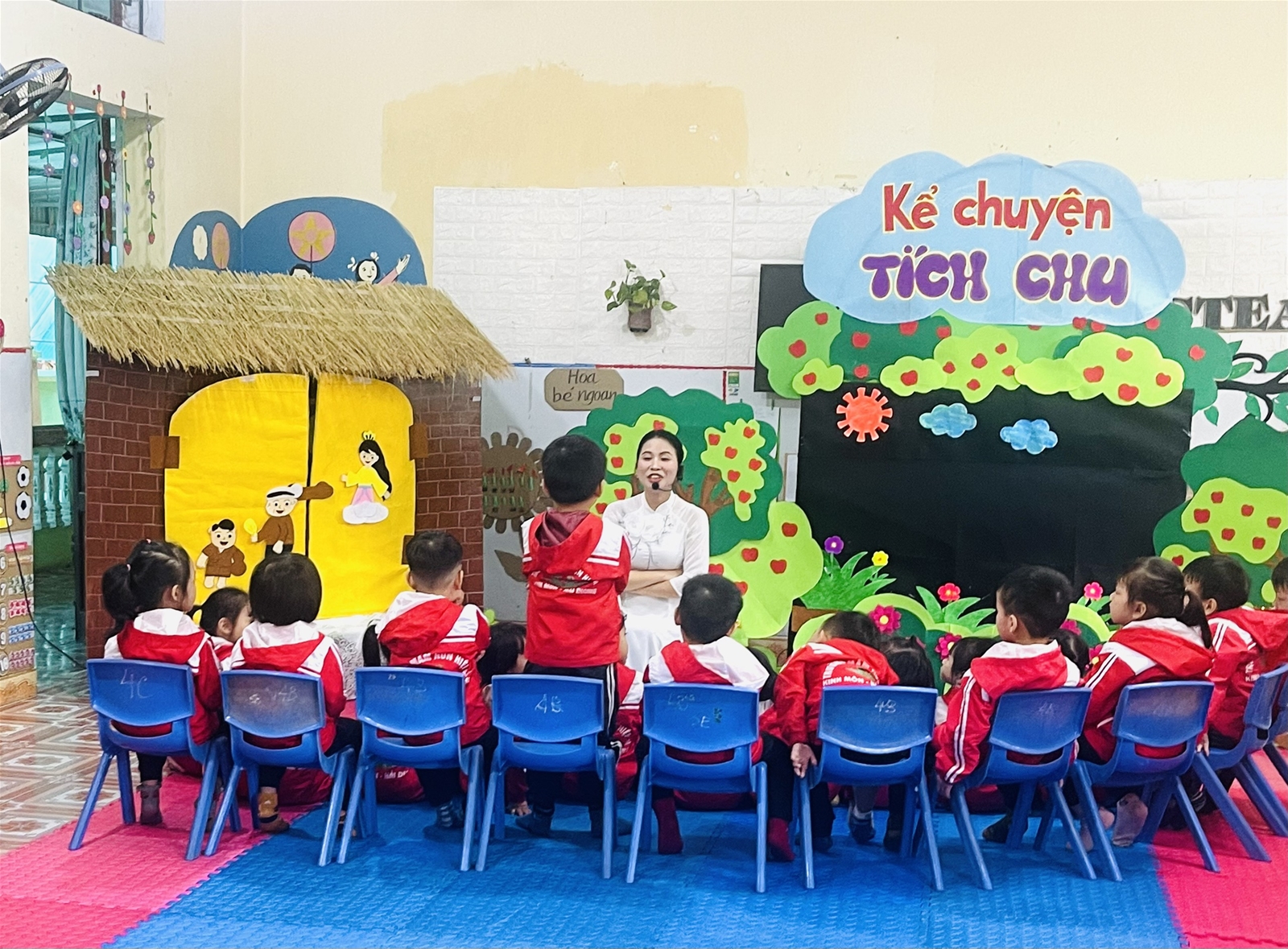 Hình ảnh cô giáo: Nguyễn Thị Thanh Quý dạy hoạt động Kể chuyện “Tích Chu” lớp 4 Tuổi B và Cô giáo: Lưu Thị Huyền Dạy hát "Nhà của tôi"